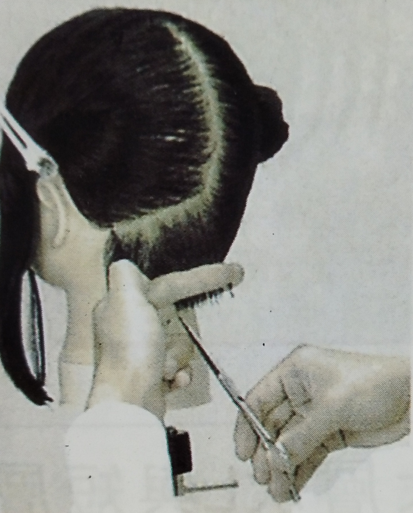 将剩下的发面用倾斜的角度一点一点地陆续取出;将发片以垂直于头皮的角度向上拉出,并用于刚才相同的方式进行修剪处理