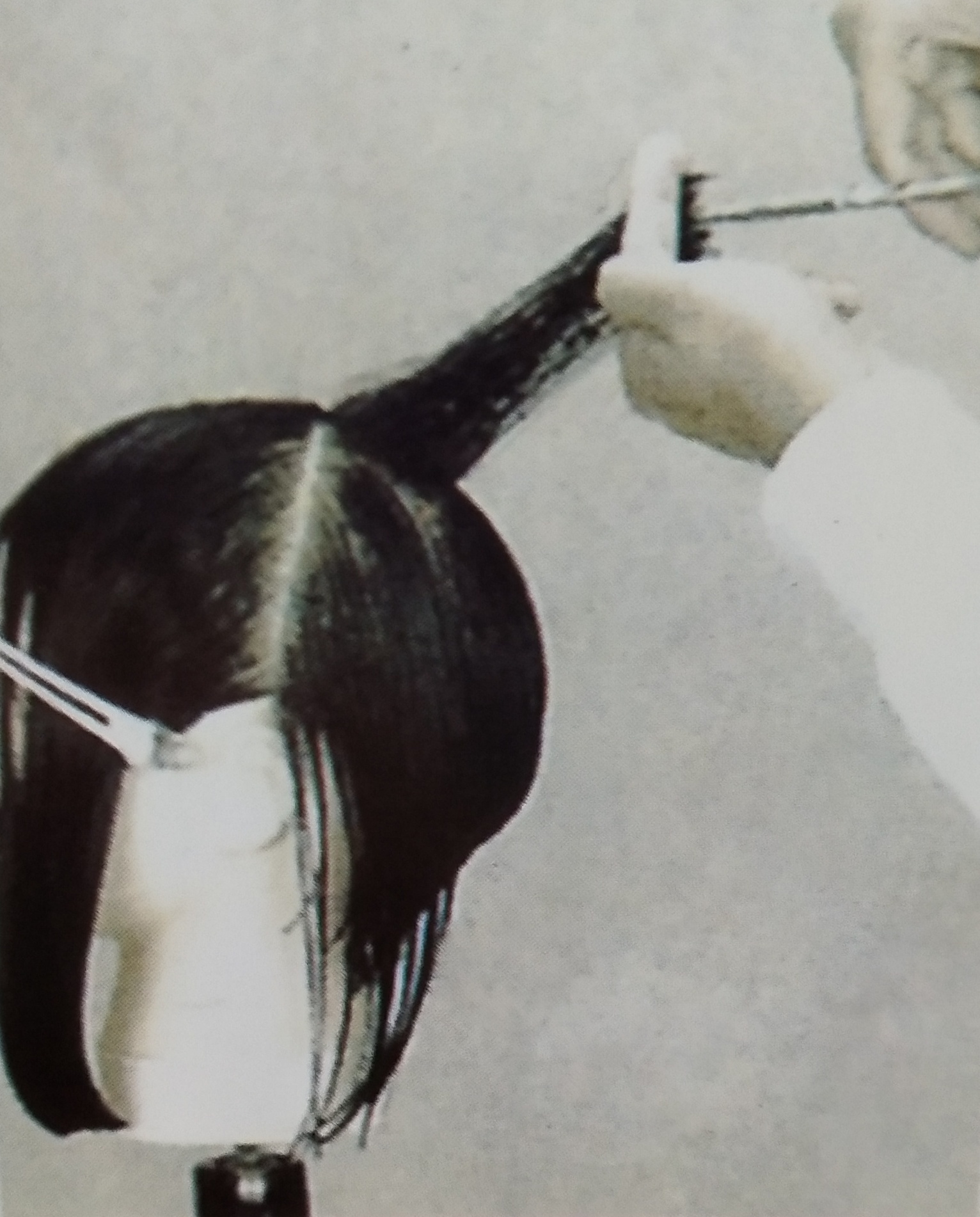 再来是发面No3的处理步骤;用比刚才后还要倾斜的角度将发面取出;之后,用比发面No2还要高一点的角度将发片拉高并做修剪动作;