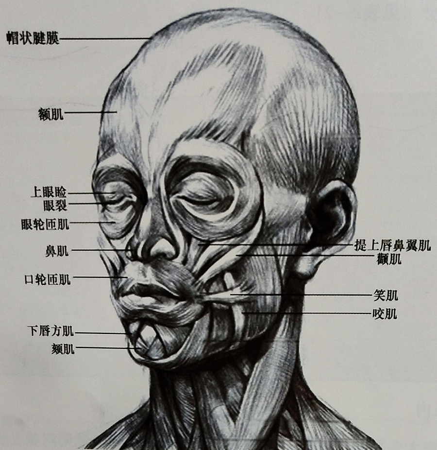 面部的肌肉大多数是一端附着骨骼或腱膜、筋膜上另一端则附着皮肤。面部肌肉虽然也可以受意识支配,但是更主要的是在情绪的影响下专管传达面部细致而又复杂的感情。面部肌肉分为表情肌和咀嚼肌两部分。化妆师必须掌握面部的肌肉形态、走势及其变化规律,才能塑造出生动的人物形象。